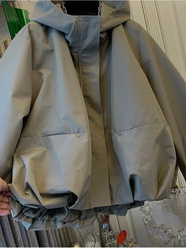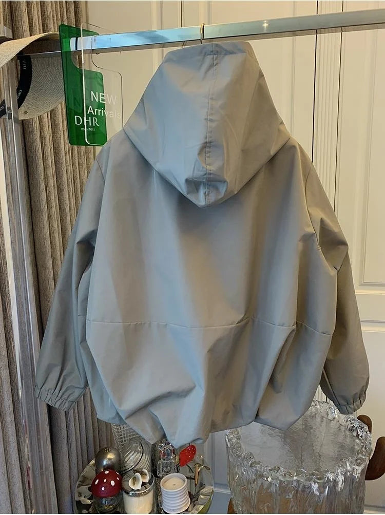Unique Women Spring Autumn Hooded Short Jacket Casual Drawstring Pocket Windbreaker Loose Zipper Basic Coat